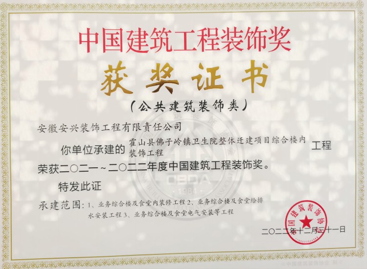 由安兴装饰公司施工的霍山县佛子岭镇卫生院整体迁建项目综合楼内装饰工程、霍山县妇幼保健院新院区一期综合楼装饰工程等五项工程荣获2021—2022年度中国建筑工程装饰奖。安兴装饰公司始终注重对新技术的创新研发和推广应用,科技引领企业高质量发展并取得了丰硕的成果。安兴装饰公司荣获四项建筑装饰行业科学技术奖,其中“复杂围护结构施工脚手架关键技术研究与应用”荣获2022年建筑装饰行业科学技术奖创新成果一等奖,安徽省现代智能综合交通创新基地(一期)项目精装修施工荣获2022年建筑装饰行业科学技术奖创新工程二等奖。