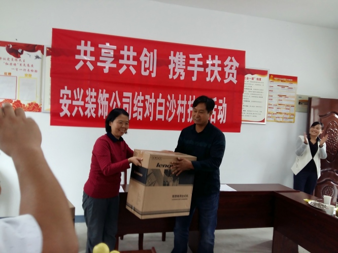 在白沙村委会召开的结对帮扶座谈会上,眭伟华副总经理对各级单位为扶贫工作做出努力表示钦佩,同时给予了高度赞扬。眭伟华副总经理向与会人员介绍了公司发展历程、发展规划,安兴装饰公司作为国企改制的民营企业,作为省内建筑装饰行业具有很高影响力企业之一,积极履行社会责任,勇担社会义务,积极贯彻国家关于扶贫工作的相关要求,同时表示安兴装饰公司选择省级贫困村——白沙村作为精准扶贫的帮扶对象,就是为了切实践行国家精准扶贫政策,为共建小康社会承担企业应有的责任。